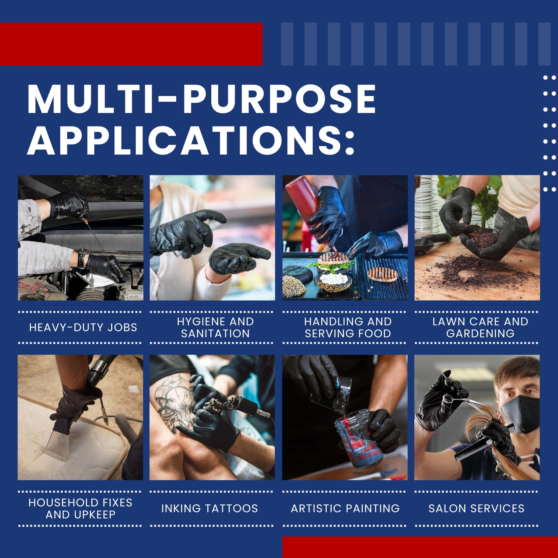 Gentle & safe: Offering a latex-free composition, these black nitrile gloves stand as a safe and comfortable alternative for individuals with latex allergies, avoiding potential skin discomfort.