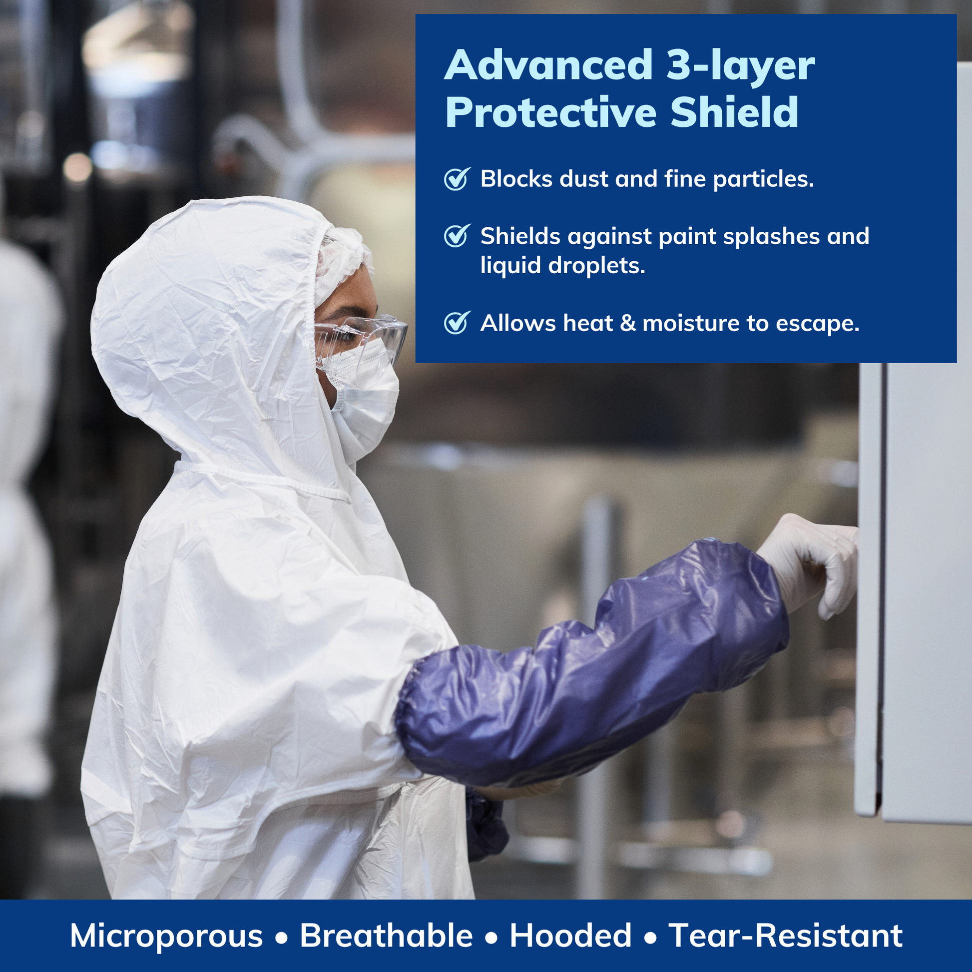 Comes with front zipper for easy accessibility, attached hood for greater protection, and elastic cuffs around the wrists and ankles for a comfortable, secure fit.